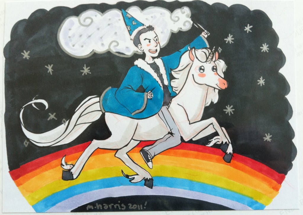 “Great, here’s what I need. I want you to draw me a wizard, riding a unicorn, on a rainbow, in space.” A homage to one of my favorite Penny Arcade strips.