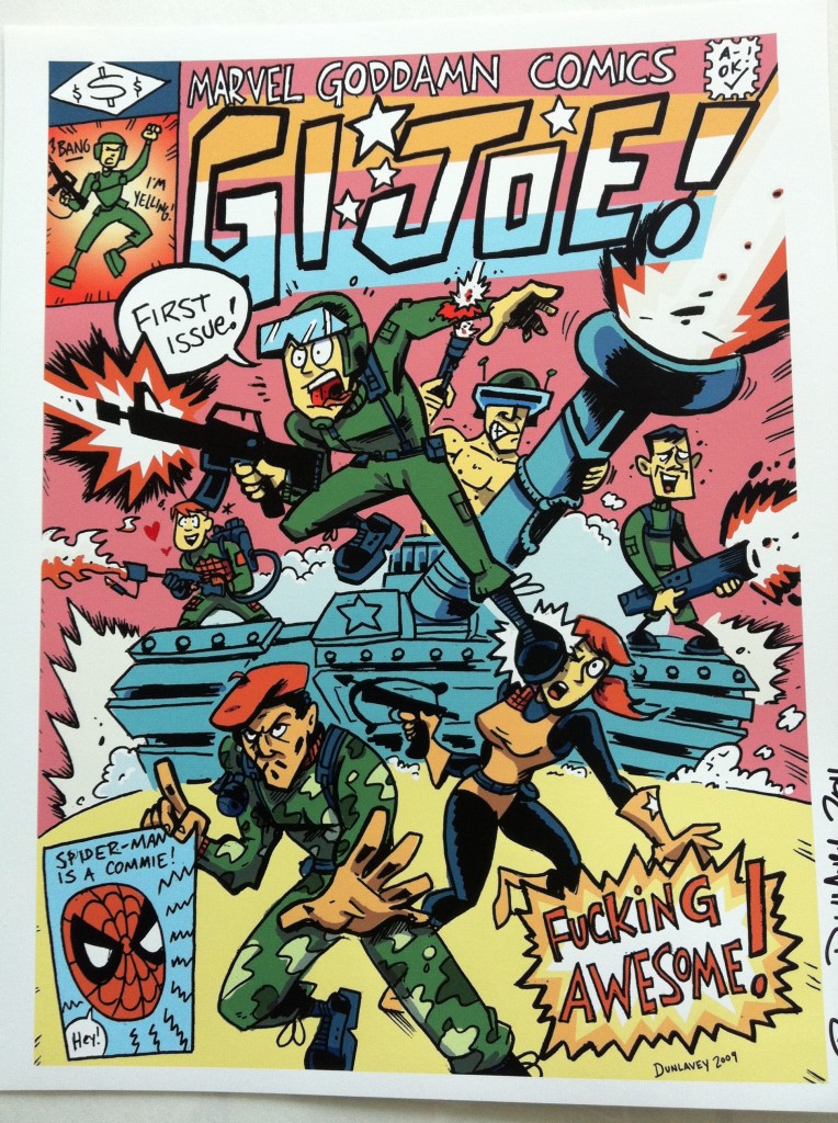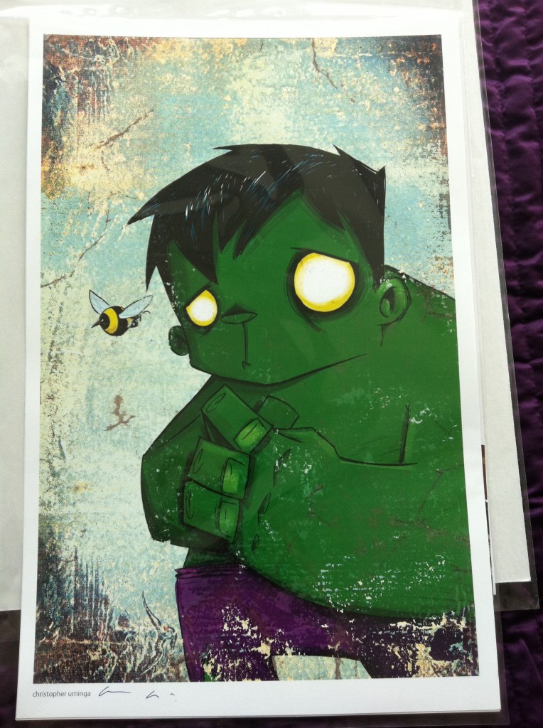 I then engage in America’s favorite past time: SHOPPING! I start buying tons of random shit. It’s the last day, and people want to sell as much of their wares as they can. I am reminded of this Penny Arcade strip. I pick up a Street Fighter print, a random Ninjas print, a GIJoe print, a Hulk print, and a hilarious calendar, all in the space of ten minutes!